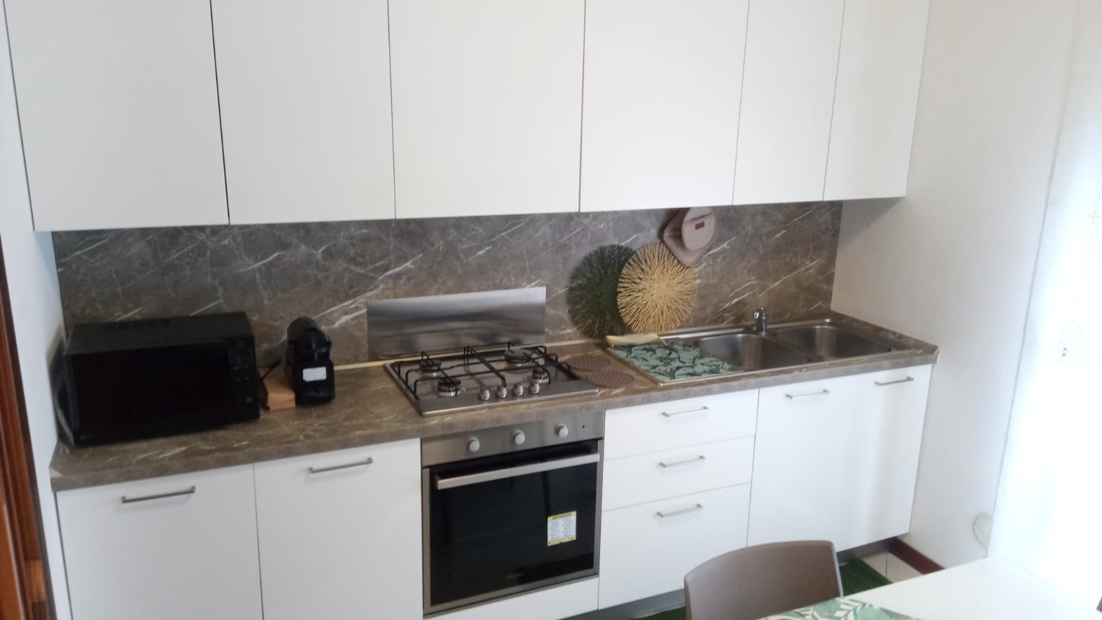 Cucina con 4 fuochi ad induzione, lavastoviglie, macchiana del caffe a capsule, microonde. frigorifero e congelatore, totalmente attrezzata di tegami, posate e stoviglie